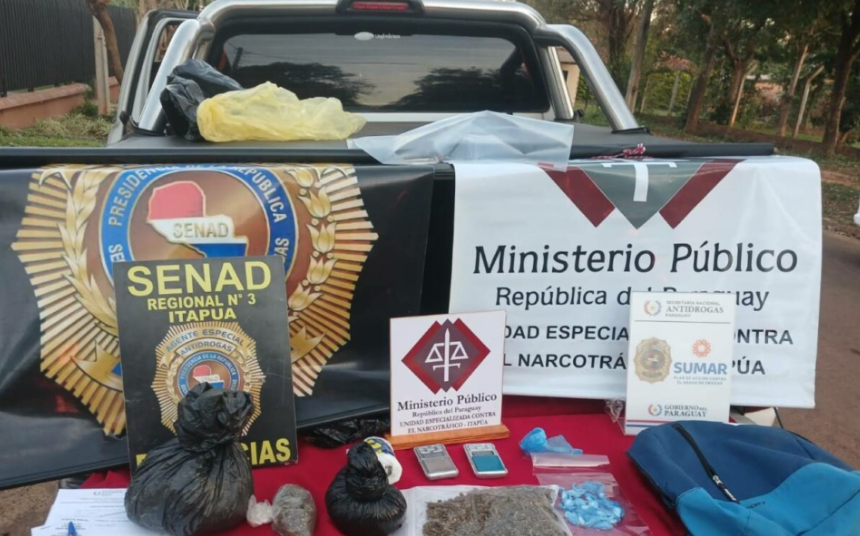 Un hombre atropelló a un agente de la Secretaría Nacional Antidrogas (Senad), cuando rajó del control que la comitiva fiscal-policial intentó realizar en su automóvil en Coronel Bogado. Durante la persecución, el ñato habría lanzado una mochila que contenía droga´. El procedimiento se realizó en plena vía pública en el barrio San Blas de Coronel Bogado donde un hombre fue sorprendido con cocaína y marihuana en su poder, según los intervinientes. Se trata de Marcos M., quien se encontraba en un automóvil cuando fue interceptado por agentes de la Senad. El mismo al percatarse atropelló al agente antridrogas Martin Yeruta y al Asistente Fiscal Guillermo Zotelo.En su huida, en plena persecución, el mismo habría arrojado una mochila de color azul, cuyo interior contenía 14 tocos de cocaína, totalizando 10.3 gramos en total y 4 bolsitas de marihuana picada, totalizando 904 gramos. Actualmente ya se impartió orden de captura sobre el tipo que logró darse a la fuga. los agentes de la comisaría local acompañaron un allanamiento en una residencia del barrio San Blas de Coronel Bogado, donde encontraron el rodado que conducía el hombre, y otros elementos, que lo vincularían con el microtráfico.