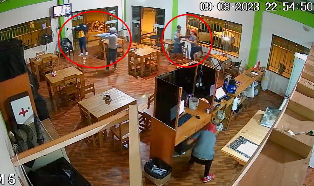 Las cámaras de vigilancia del local gastronómico capturaron todo el accionar de los asaltantes. Un sexto integrante de la banda esperaba en la calle al mando de un vehículo blanco, presumiblemente un Peugeot Active que fue robado horas antes en el barrio San José de Ciudad del Este.